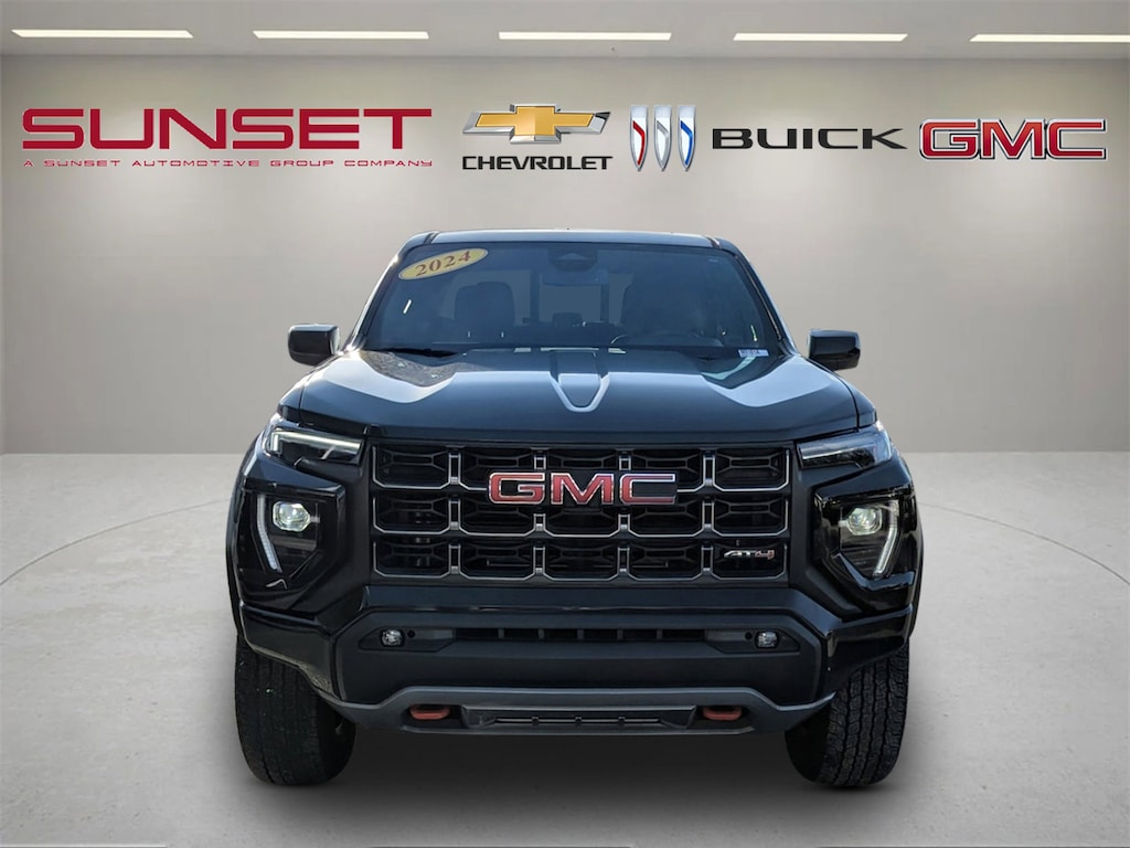 CARFAX One-Owner. Onyx Black 2024 GMC Canyon AT4 4SG 2.7L I4 Turbocharged DOHC 16V LEV3-SULEV30 310hp 4WD 120-Volt Bed Mounted Power Outlet, 2 1st Row USB Charge/Data Ports, 2 Rear USB Ports in Center Console (Charge-Only), 3.42 Rear Axle Ratio, 4-Wheel Disc Brakes, 6-Speaker Audio System Feature, 8-Way Power Driver Seat Adjuster, Apple CarPlay/Android Auto, Auto High-beam Headlights, Automatic Emergency Braking, Automatic Locking Rear Differential, Brake assist, Canyon Pro Safety, Driver & Front Passenger Illuminated Visors, Driver Mode Selector, Dual-Zone Automatic Air Conditioning, EZ-Lift & Lower Tailgate, Following Distance Indicator, Forward Collision Alert, Front fog lights, Front LED Fog Lamps, Front Pedestrian & Bicyclist Braking, Heated Driver & Front Passenger Seats, Heated Power-Adjustable Outside Mirrors, Inside Rear-View Auto-Dimming Mirror, IntelliBeam Automatic High Beam On/Off, Interior Overhead Courtesy Light w/Dual Reading Lamp, Lane Keep Assist w/Lane Departure Warning, Low tire pressure warning, Manual Rear-Sliding Window, MultiStow Tailgate, Navigation System, Power Driver Lumbar Control Seat Adjuster, Power driver seat, Preferred Equipment Group 4SG, Radio: 11.3" Diagonal Premium GMC Infotainment Sys, Rear of Console 120-Volt Power Outlet, Rear step bumper, Rear-Window Electric Defogger, Remote Vehicle Starter System, Security system, SiriusXM w/360L, Split folding rear seat, Tailgate Keyed Cylinder Lock, Telescoping steering wheel, Tilt & Telescopic Manual Steering Column, Tilt steering wheel, Wheels: 18" x 8.5" Dark Gray Machined Finish Alum, Wireless Apple CarPlay/Wireless Android Auto.